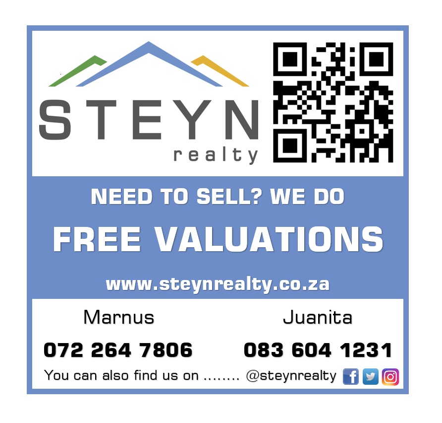 All our stock can be viewed on our website at www.steynrelty.co.za and you are welcome to like and follow us on Facebook, Instagram and Twitter. We recently started a YouTube channel for all our virtual tours and other videos ….. please visit https://www.youtube.com/channel/UCLGbOvvPjY6zMh2kAQDhHTQ