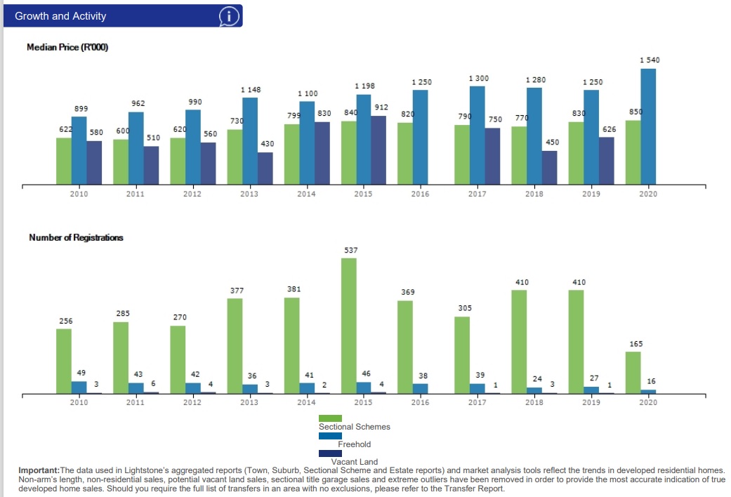 Sectional Title properties contributing to 87.45% of the total market stock with 3929 properties / units. These units vary from 50m², 1 bedroom apartments / flats selling from R 400 000 to 150 to 200+m², 3 to 4 bedroom properties selling above the R 1 500 000 mark with some exceptions.