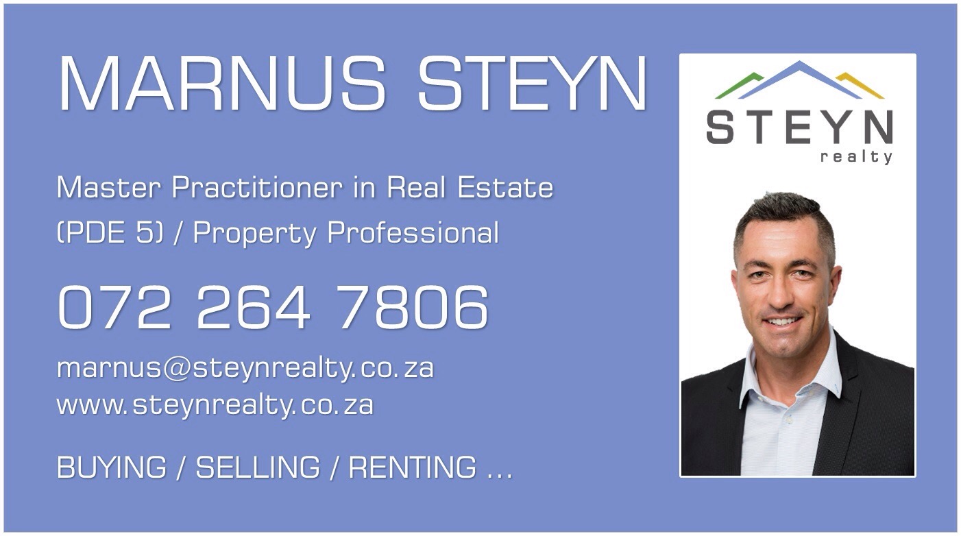 For any real estate related queries or info, pls feel free to contact me on 072 264 7806 or email marnus@steynrealty.co.za