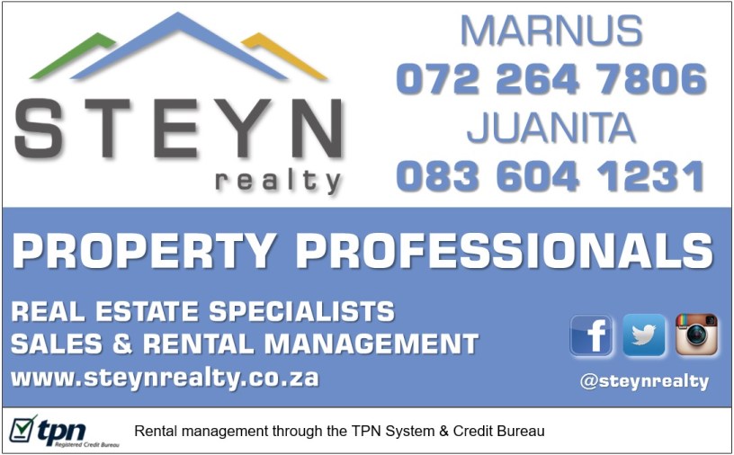 For more on our rental services, please email rentals@steynrealty.co.za or contact Marnus Steyn on 072 264 7806.